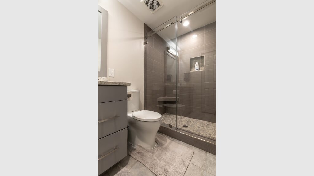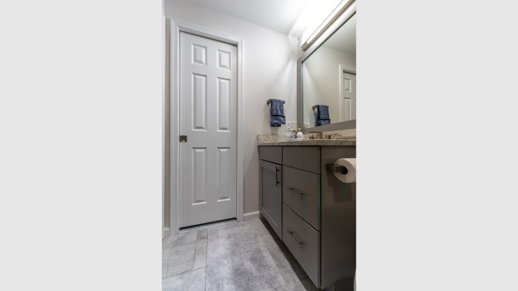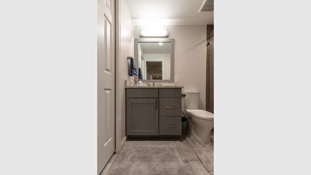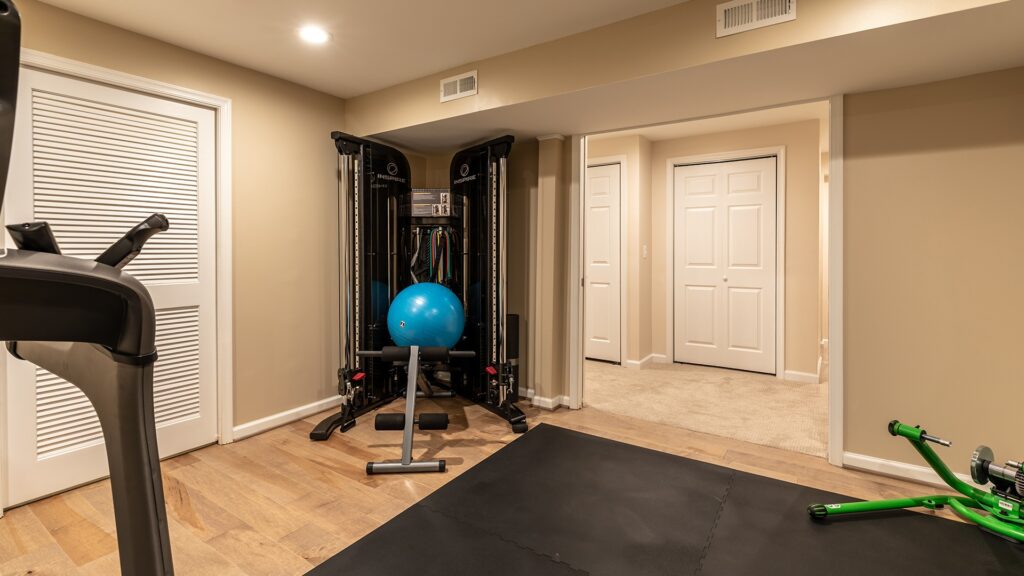 The other end of the basement own its private guest’s bedroom, full bathroom and a Gym space.