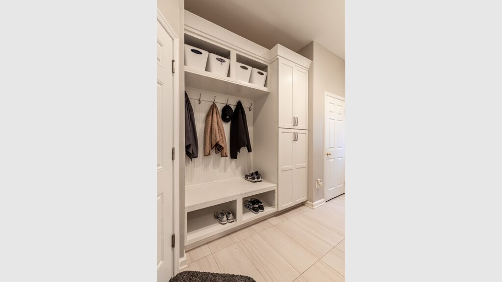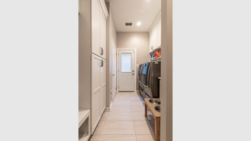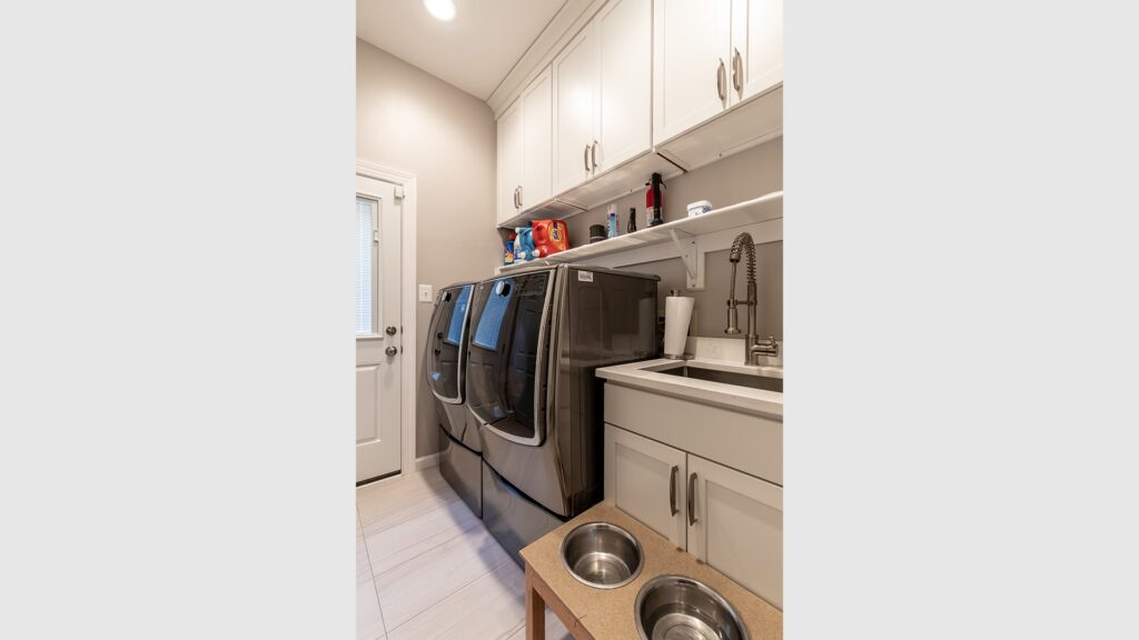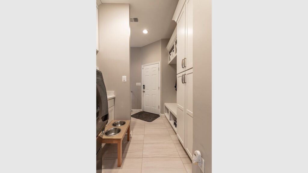 The Laundry room was expanded by relocating the furnace and hot water heater and rerouting duct work giving them a mudroom they always wanted. The entire basement was furnished with heated floor and wide wood plank tiles.