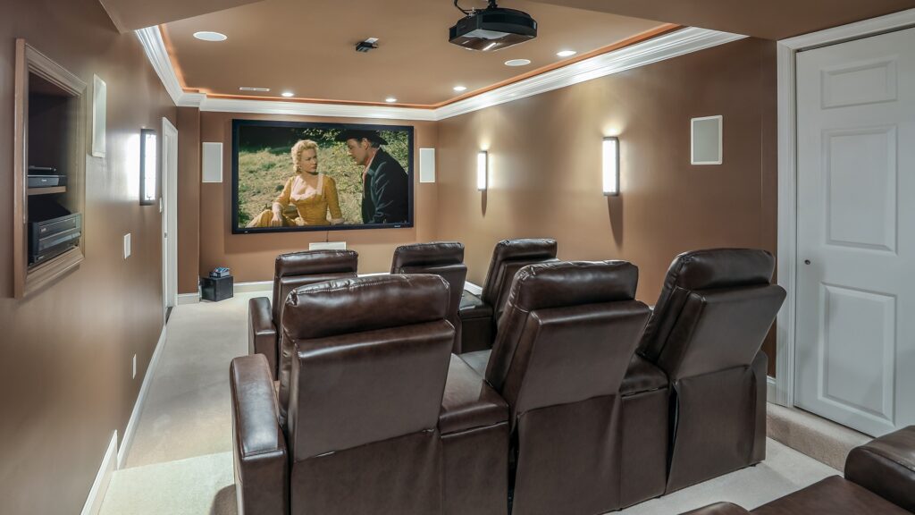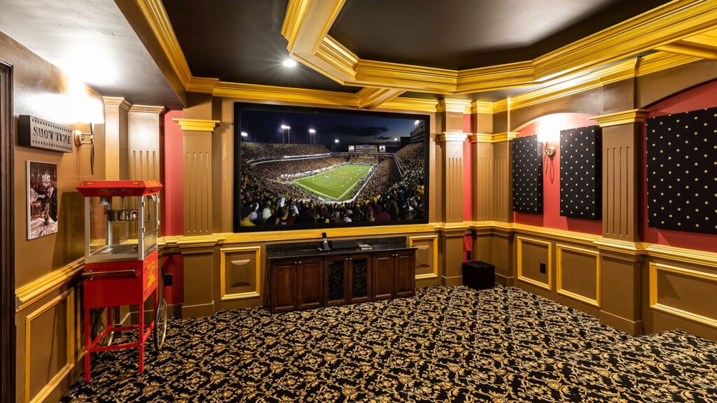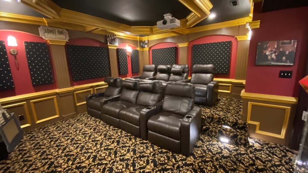 New movie theater room with multi-level seating, sound panel walls, couple row of recliner seating’s,120” screen, state of art AV system, custom pattern carpeting, surround sound&in wall speakers,custom molding and trim with fluted columns, custom mahogany Theater doors.
