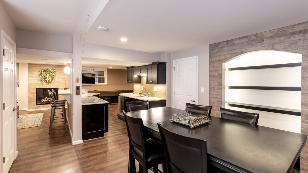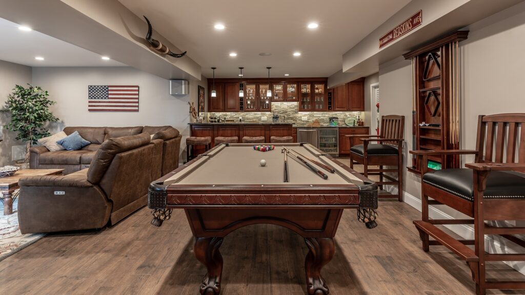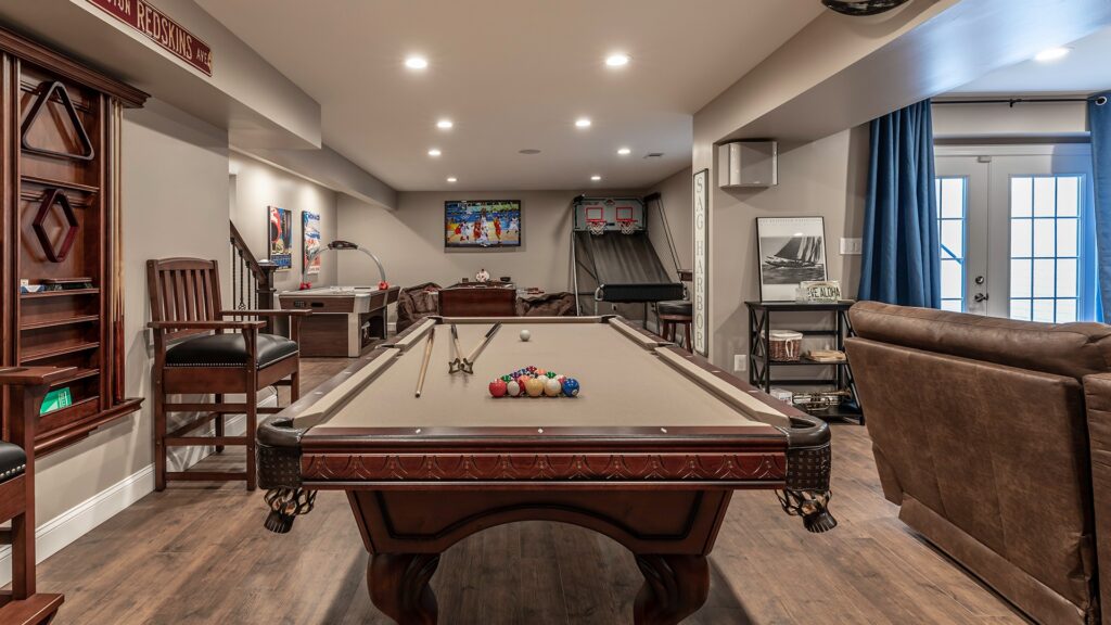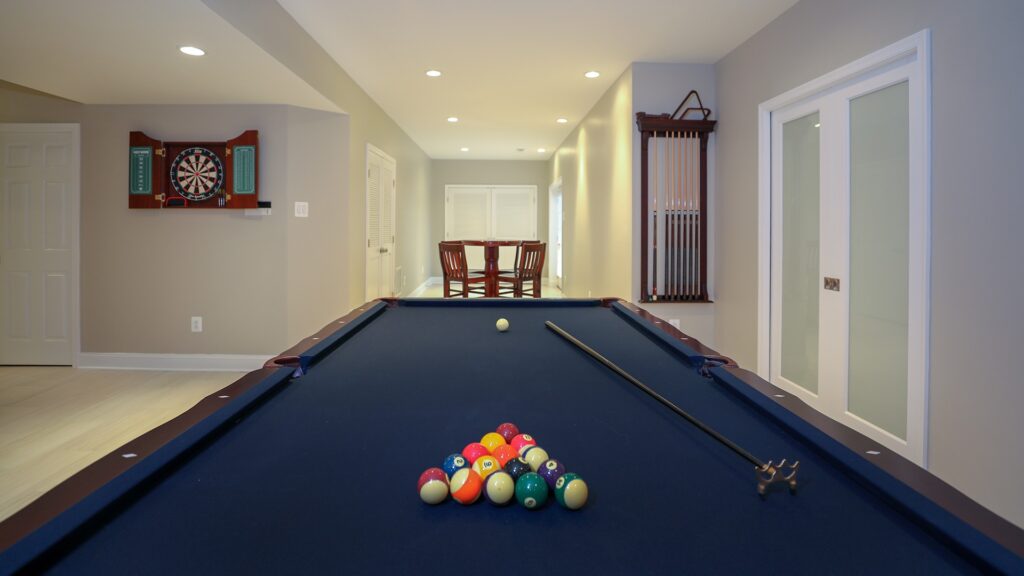 Our design staff laid out few options for the couple and they all agreed to open up a big partition of unfinished area and convert the dragged looking basement to a “Dave & Buster “of their own.