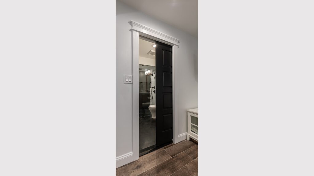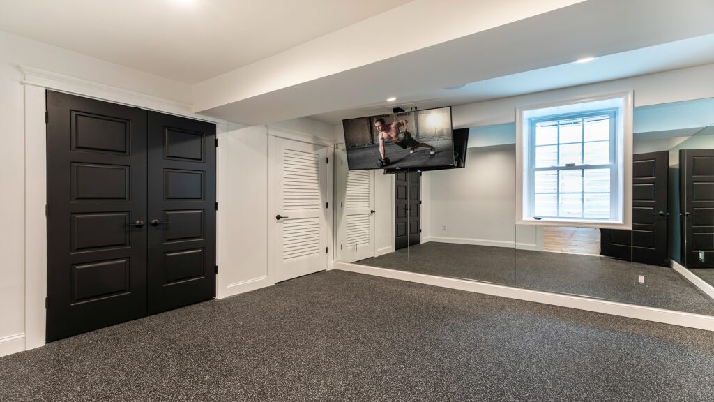 The other end of the basement own its private guest’s bedroom, full bathroom and a Gym space.
