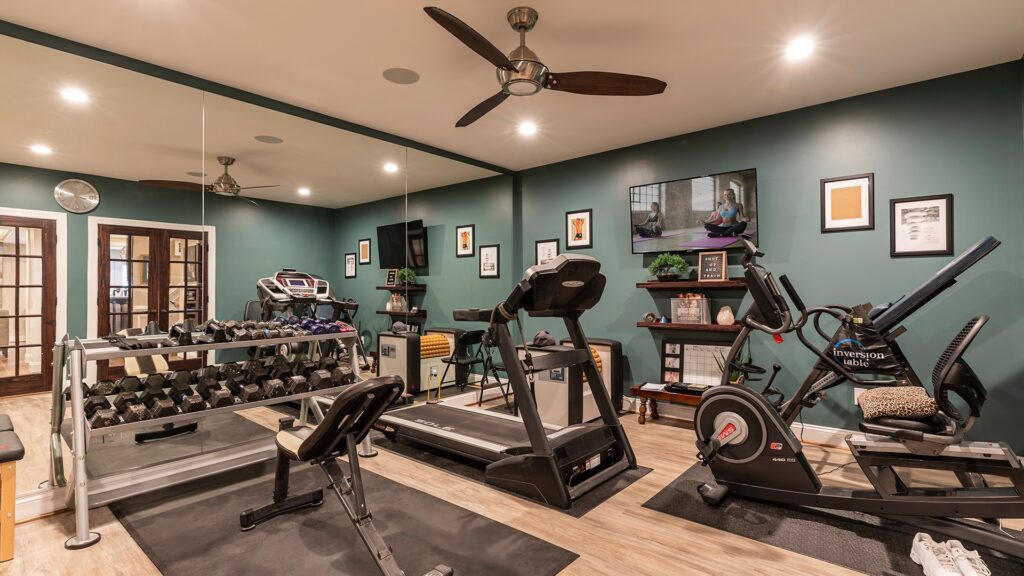 The exercise room with two French doors, full mirror walls, couple storage closets, rubber floors given them a full equipped gym at home.