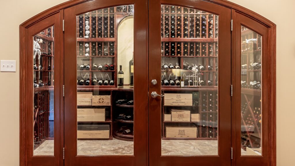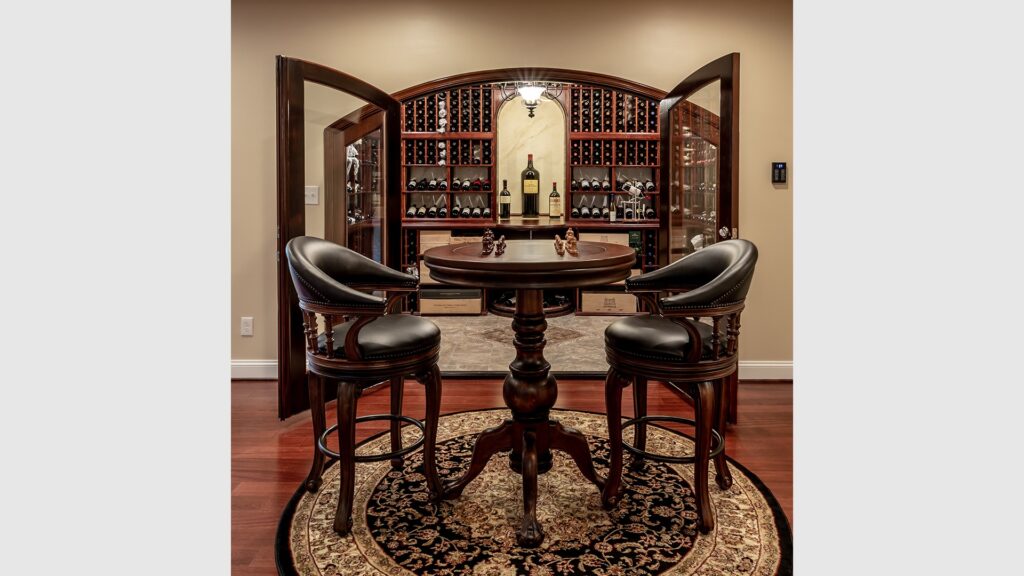 Carefully designed wine-cellar features the best-of-the-best-wine-collection in wrapped around mahogany-wine-racks, beaded-stain grade-paneling, exotic stone-counter, Muriel center-stone, equipped with high-efficiency chiller-system, behind custom-made door-arch-panel-glass-door.