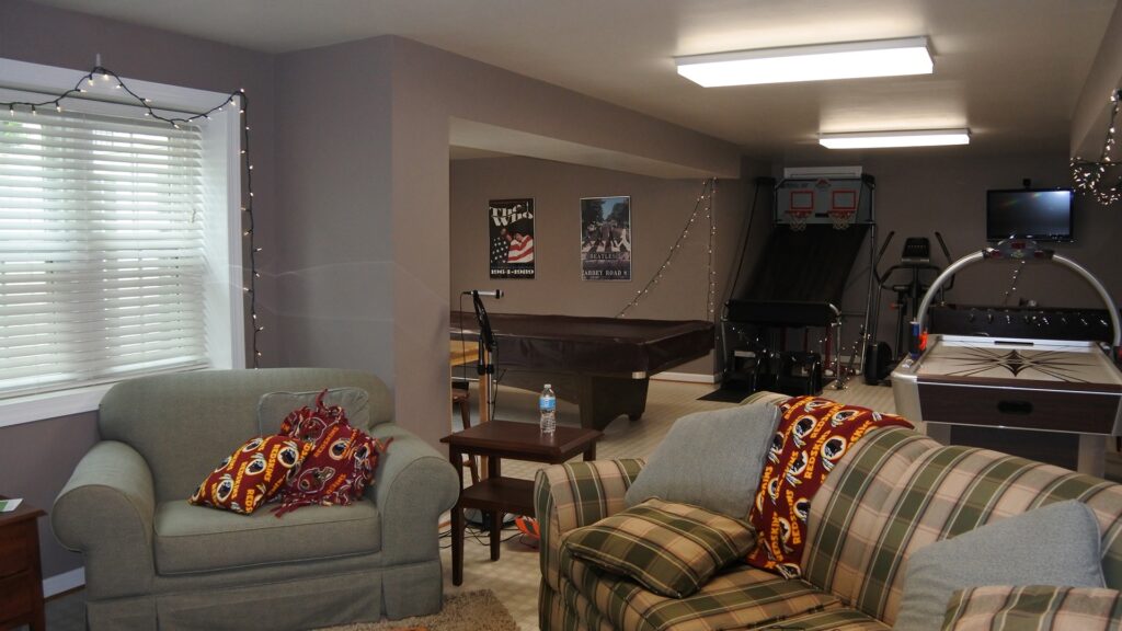 This family decided to convert their simple partially finished basement to a place that they can call gaming and hang out space for kids, yet nice enough to entertain larger group and adult friends as well.