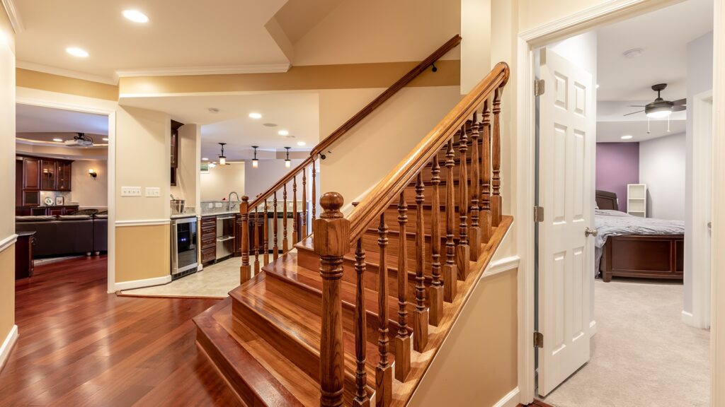 The staircase opened up, furnished with wood floor and wrought iron rail has opened up the view as you enter this basement.